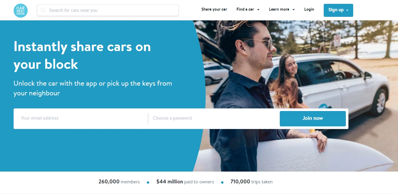 그리고 또 하나의 차량 공유 플랫폼으로는 카 넥스트 도어가 있습니다. 카 넥스트 도어는 2013년 호주에서 시작된 차량 공유 서비스로 개인 소유의 차량을 시간 단위로 대여해주는 시스템을 기반으로 하는데요. 차 소유주가 전용 어플리케이션에 자신이 이용하지 않는 시간 대를 설정해 놓으면 차가 필요한 주변 고객과 자동으로 연결해 주는 방식입니다. 전체 가입자 수는 약 26만 명, 이용 횟수는 약 70만을 넘어섰고, 현재도 계속 증가하고 있습니다.