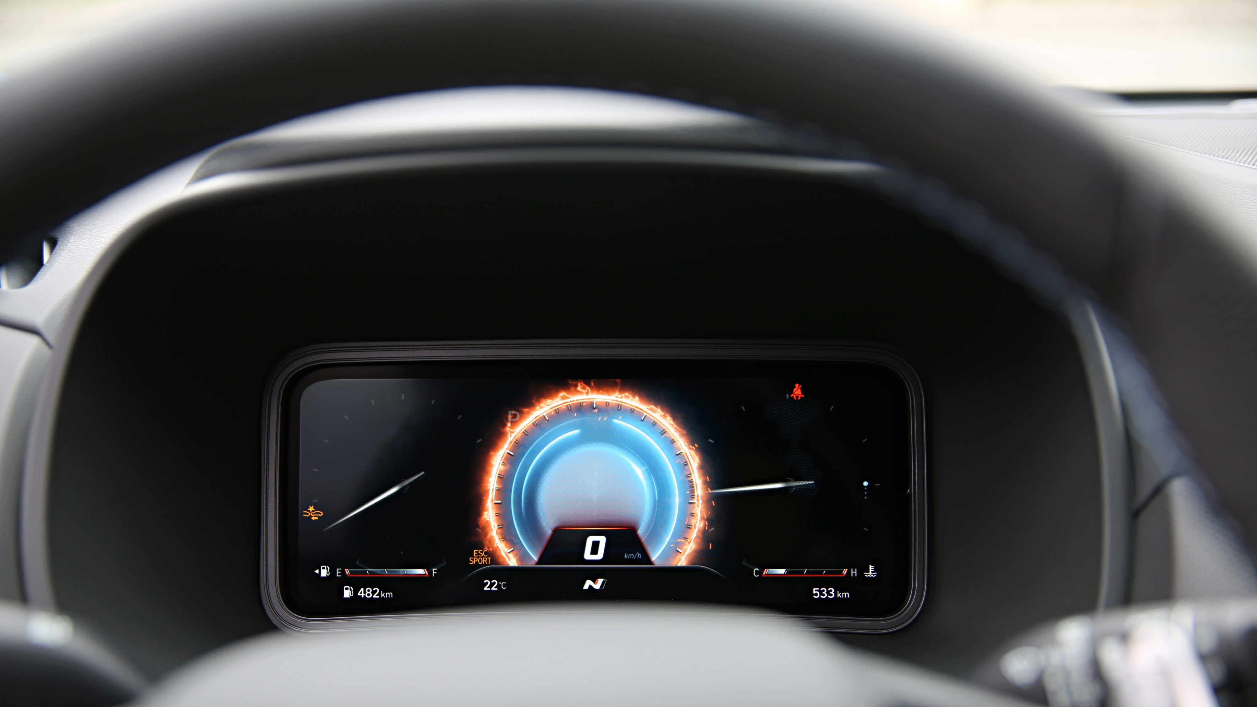 드라이빙 환경에서 필요한 정보를 직관적으로 알 수 있도록 한 장치 두 가지가 돋보이네요. N 전용 헤드업 디스플레이는 단수, RPM, 변속 타이밍 등의 고성능 특화 콘텐츠를 운전자에게 전달합니다. 디지털 클러스터의 원형 디자인을 모토로 필수 정보를 직관적으로 알 수 있게 한 점은 좋은 점수를 받을 만하네요.