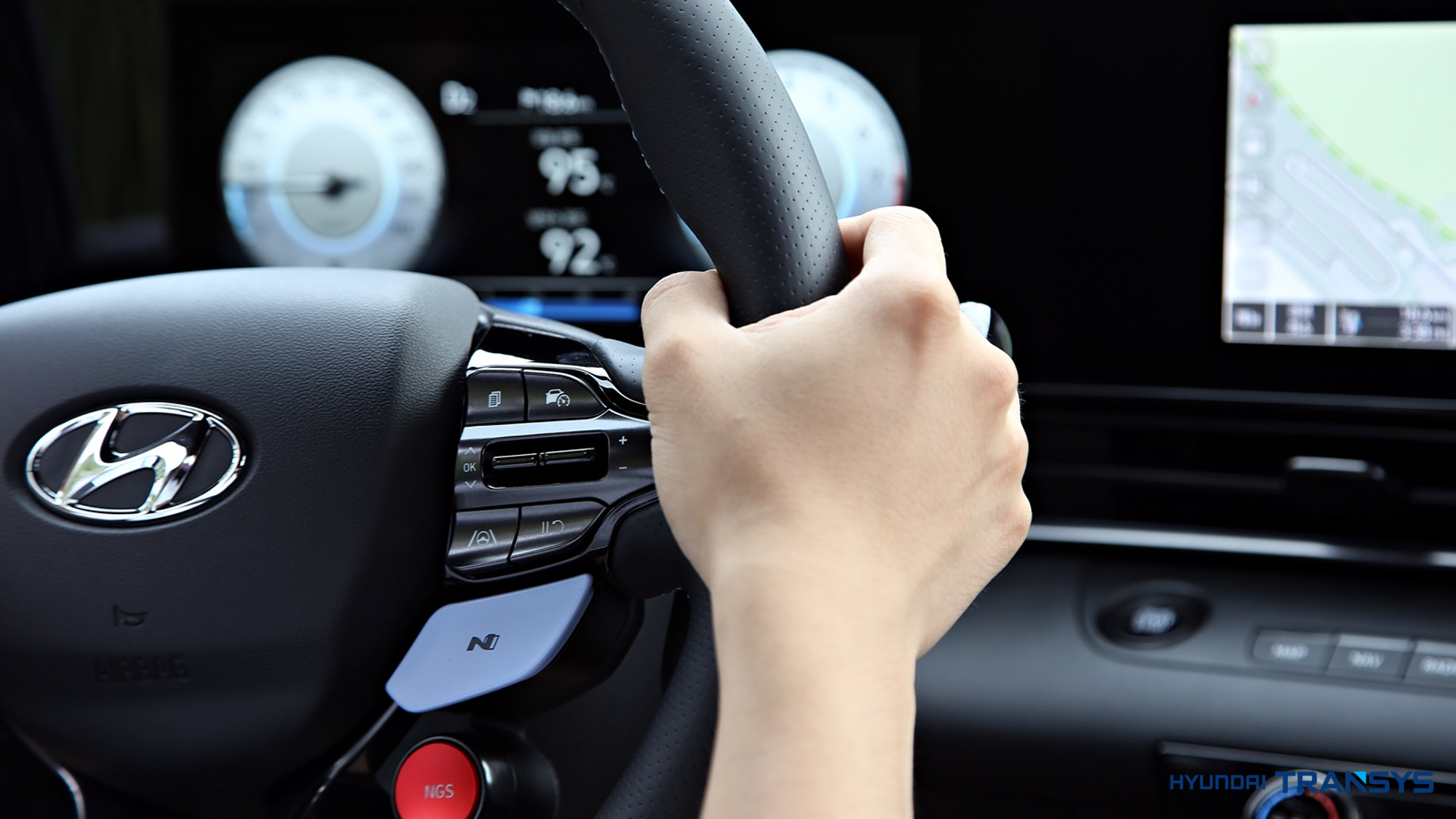 일전에 서킷에서 몰아 본 코나N과 같이 N그린 쉬프트(NGS) 버튼이 핸들에서 가장 눈에 들어왔습니다. 직선구간에서 이 버튼을 누르고 풀 악셀을 밟으면 20초 동안 엔진과 변속기 성능 출력이 최대치로 상승됩니다.