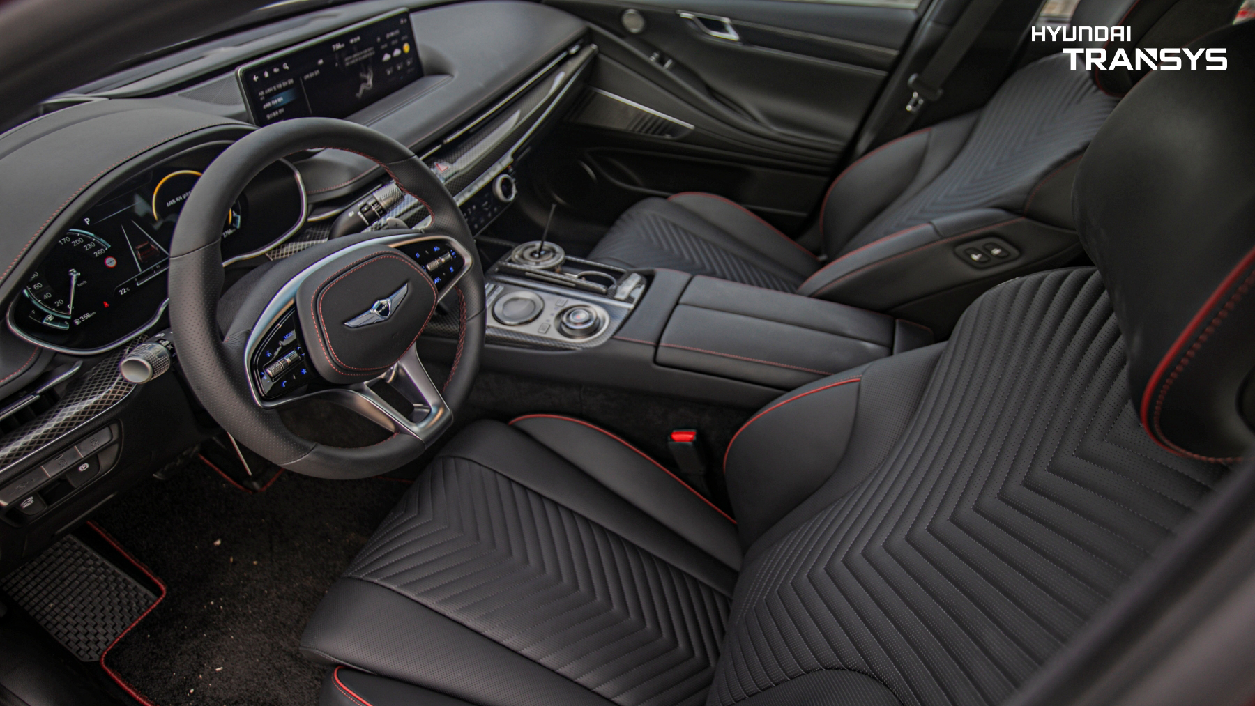 제네시스의 G-매트릭스라고 하는 격자무늬를 살린 것이 매력적이고요. 자카드 리얼 카본, 실버 하이브리드 위빙 두가지 옵션이 있고 천장은 스웨이드 재질로 마감했어요. 12.3인치 3D 클러스터가 센터페이시아 상단에 자리잡고 있고, GV70 부터 사용한 스포츠 전용 스티어링휠의 매력적인 그립감 등이 역시 스포츠라는 확실한 차별화를 느낄 수 있었습니다.