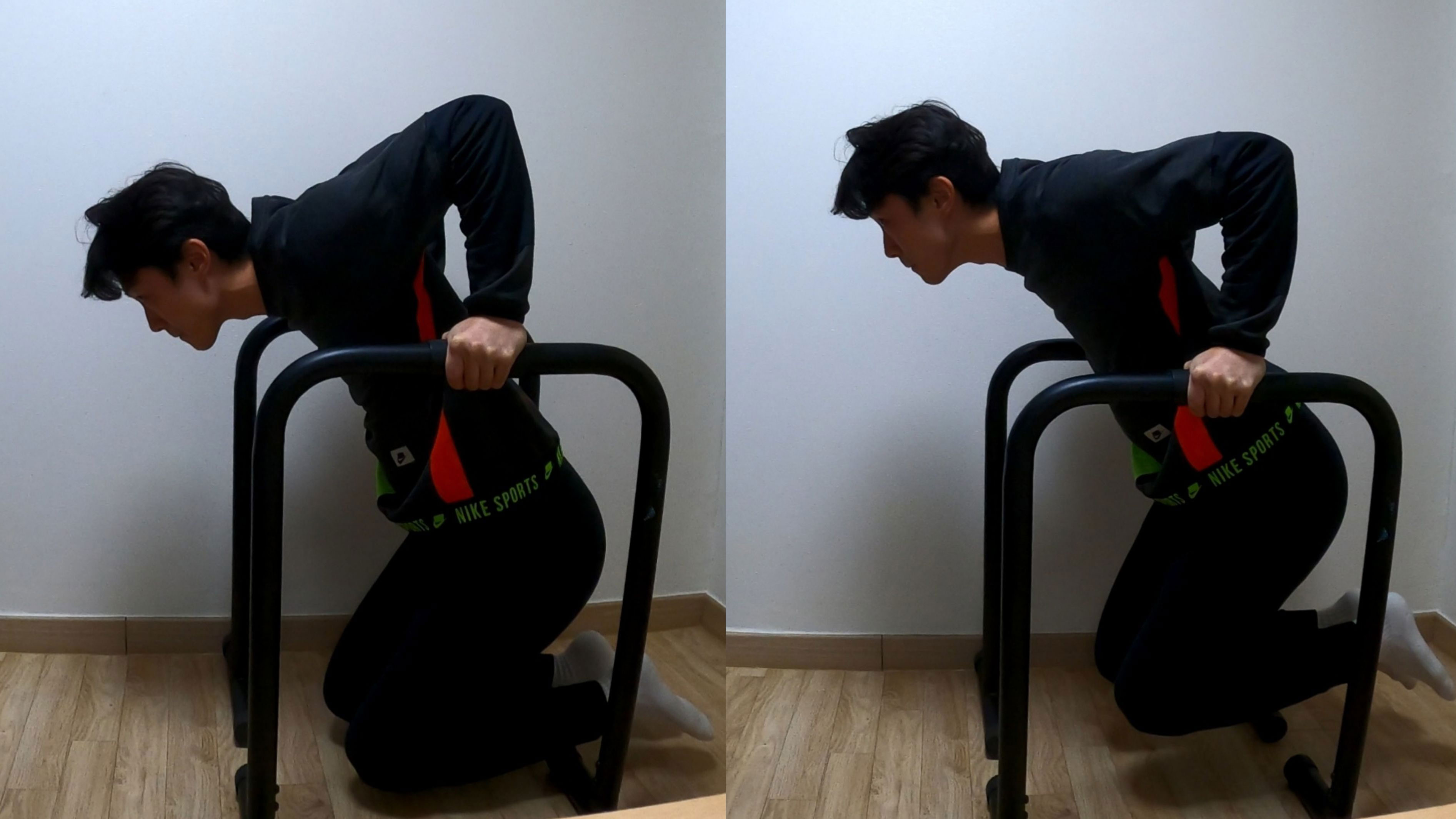어깨가 유연하고 통증이 없다면 좌측과 같이 더 깊게 내려가도 무방하지만 기본적으로는 우측 사진과 같이 팔의 각도가 직각이 되도록 내려와 주세요. 단, 통증이 있다면 무리하지 마시고 전문의와의 상담을 권장합니다.