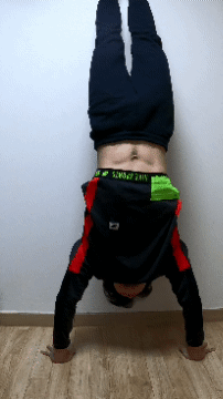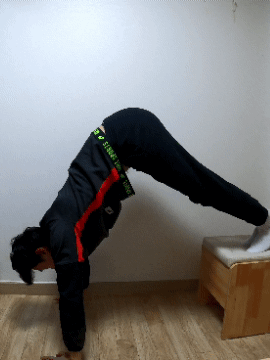 벽에서 20~30cm 정도 떨어진 지점에 손을 짚고 물구나무를 섭니다. 코어를 단단히 잡아주고 체중을 컨트롤하며 천천히 내려왔다가 다시 힘차게 밀어줍니다. 체중을 손목이 부담해야 하기에 부상이 걱정된다면 푸쉬업 바를 이용하셔도 됩니다.