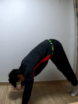 물구나무 자체가 부담스럽거나 아직 어깨 근력이 충분하지 않다면 ‘파이크 푸쉬업’이라는 대체 동작도 있는데요. 먼저, 골반을 높이 들고 무게중심을 앞쪽에 둡니다. 그 자세에서 사선으로 체중을 쏟은 후, 다시 밀어준다는 느낌으로 반복해주시면 됩니다.