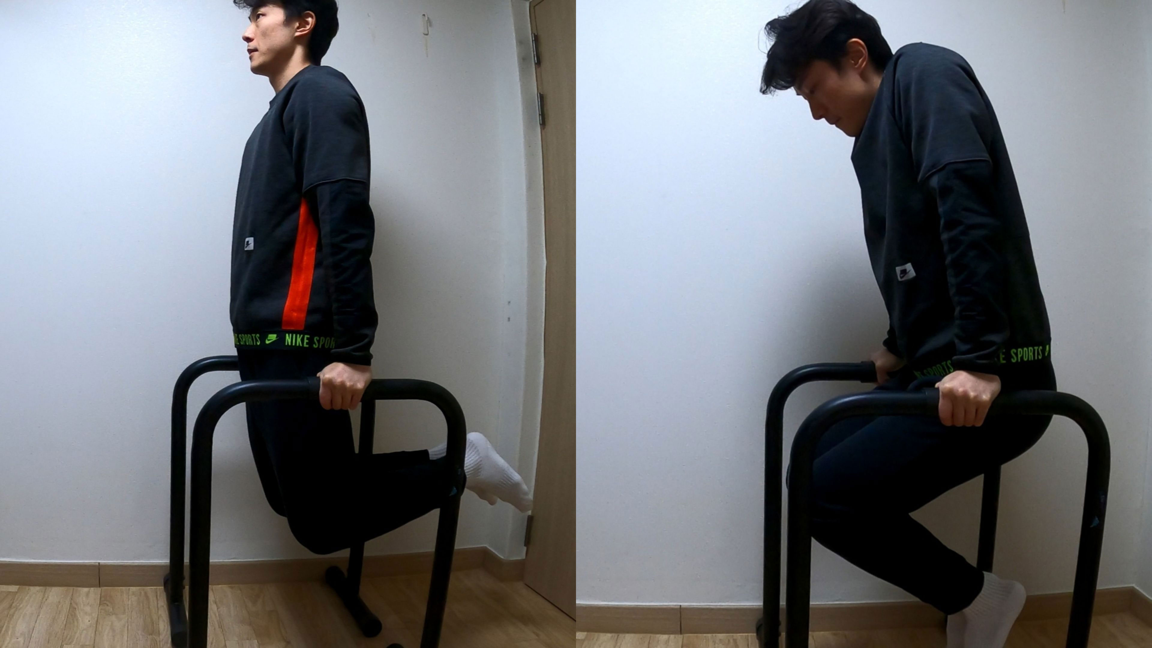 평행봉을 이용하는 동작으로 두 팔에 체중을 싣고 팔을 굽혔다 펴는 동작입니다. 자세를 어떻게 잡는지에 따라 타겟 부위가 가슴이 될 수도 있고 삼두(팔 뒤쪽)가 될 수도 있는데요. 이번에는 가슴 기준으로 소개해드리겠습니다.