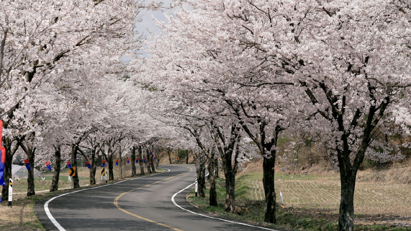 충남 청양의 장곡사 벚꽃길은 2006년 건설교통부(현 국토해양부)가 선정한 ‘한국의 아름다운 길 100’에 든 명소인데요. 청양 읍내와 가까운 주정삼거리부터 장곡사 입구까지 약 6km 굴곡진 도로를 따라 수십년 된 왕벚나무가 늘어서 있습니다. 벚꽃길 인근에서 만나는 장곡사는 칠갑산에 깃든 천년 고찰이자 국보 2점과 보물 4점이 있는 문화유산입니다.
