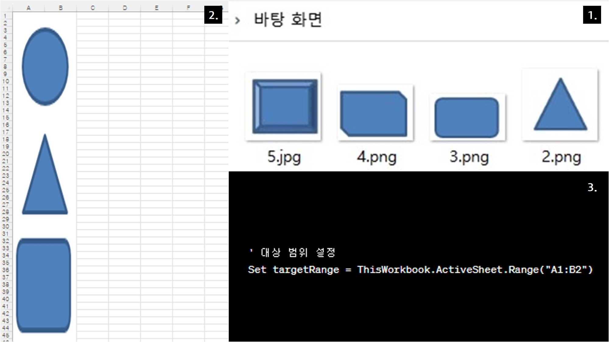 우선 바탕화면에 도형 사진을 넣어줍니다. 바탕화면에 미리 저장했던 동그라미, 세모, 네모를 엑셀에 불러왔는데요! A1:B2를 고치면 그림 사이즈를 바꿀 수 있습니다.