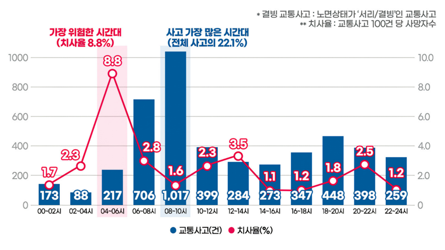 도로교토공단의 2018년~2022년의 5년간 교통사고 데이터 분석에 따르면 블랙아이스 등으로 얼어붙은 도로에서 발생하는 교통사고의 76%가 12~1월에 집중되어 있으며, 교통사고의 치사율이 일반 도로 발생 사고 대비 약 1.5배 높습니다. 특히 일정 속도 이상으로 달리는 고속도로에서는 3.4배까지 위험성이 증가합니다.