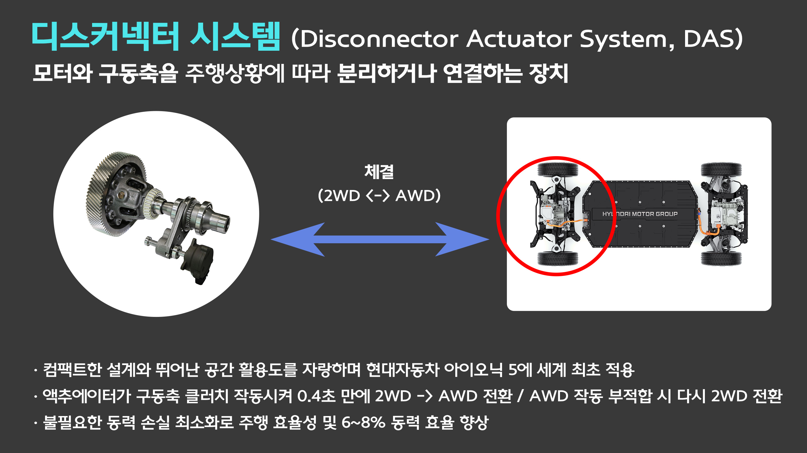 현대트랜시스가 세계 최초로 개발한 전기차용 상시 사륜구동(AWD) 디스커넥터 시스템은 눈길이나 험로 주행 상황에서는 2WD 주행에서 4WD로 구동을 전환해 접지력을 끌어올려 줍니다. 이런 상황이 아닌 고속주행 시에는 보조 구동축 연결을 끊어 2WD로 전환해 불필요한 동력 손실을 줄이고 에너지 효율을 약 6~8% 높여 주행거리를 늘려줍니다. 디스커넥터 시스템은 E-GMP 플랫폼을 사용하는 차량에 적용돼 있으며, 대표적으로 아이오닉5, 아이오닉6, EV6, EV9에 탑재되어 있습니다.