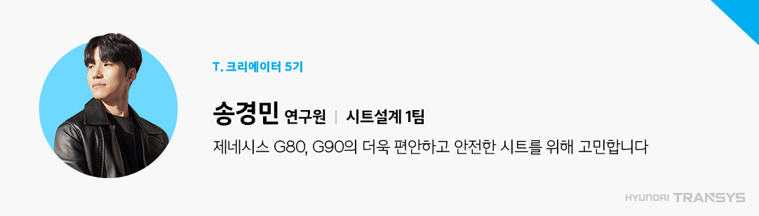 현대트랜시스 시트설계1팀 송경민입니다. 저희는 차종별 시트 개발 과정에서 발생할 수 있는 다양한 문제점을 개선하고, 양산 단계까지 책임지고 있습니다. 제네시스 G80, G90 2열 시트를 담당하는 저는 럭셔리 세단에 어울리는 시트를 완성하기 위해 노력하고 있습니다.