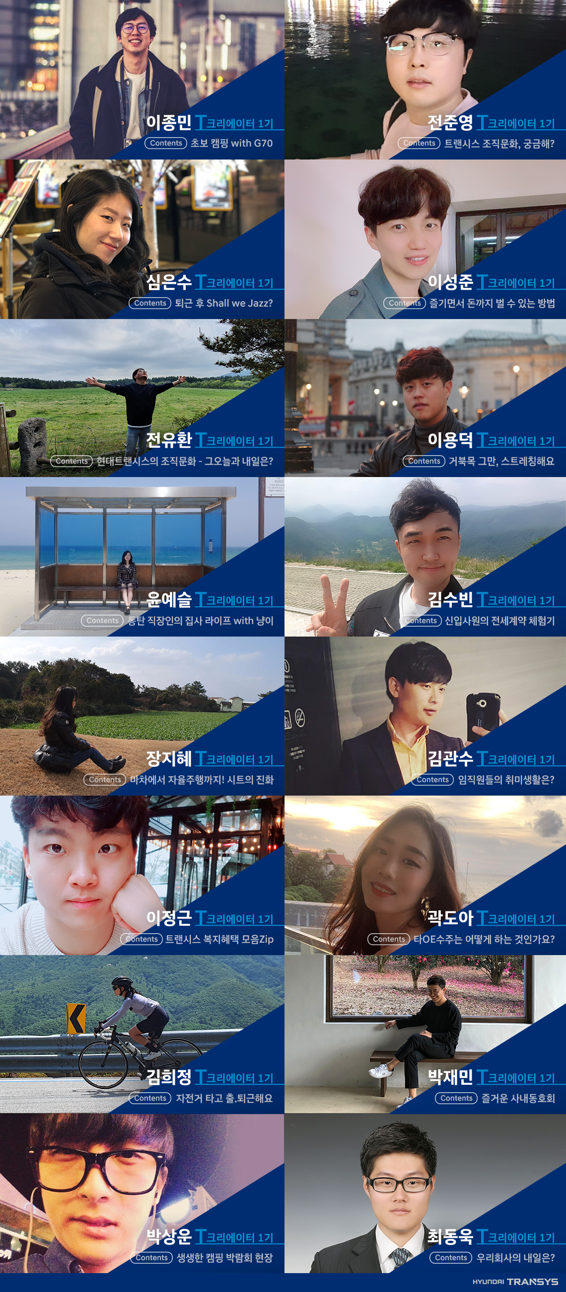 톡톡 튀는 아디이어로 멋진 콘텐츠를 선보일 T.크리에이터 1기 16인을 소개합니다. 퇴근 후 취미생활, 시트 트랜드, 사내 동호회 등 다양한 주제의 콘텐츠를 공개할 예정입니다. 각기 다른 라이프 스타일, 생각, 다양한 개성을 갖고 있는 T.크리에이터 16인, 과연 이들은 어떤 다양한 콘텐츠를 선보일까요? 기존에 올라왔던 현대트랜시스 블로그 콘텐츠와는 또 다른 매력의 T.크리에이터 콘텐츠! 기대하셔도 좋습니다.