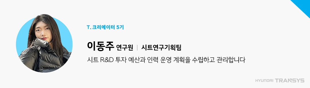저희 시트연구기획팀은 현대트랜시스 시트의 효율적인 연구 업무 수행을 위해 R&D 전략을 수립하고, 연구 과제의 관리, 성과 평가 등의 기획・지원 업무를 담당합니다. 한마디로 연구원들이 연구개발에 집중할 수 있도록 돕는 다양한 업무를 맡고 있는데요. 동탄 사업장에선 저희 팀 뿐만 아니라 전사 단위의 지원 부서, 구매, 품질 등 다양한 팀이 함께 일합니다. 부서간 협업도 잦은 편으로, 평소 같은 공간에서 자주 마주치다 보면 커뮤니케이션도 더 원활해 지는 것 같습니다. 각 층에 다른 본부를 오가면서 다양한 분위기를 체감할 수 있는 것도 동탄 사업장의 장점이라고 생각합니다.