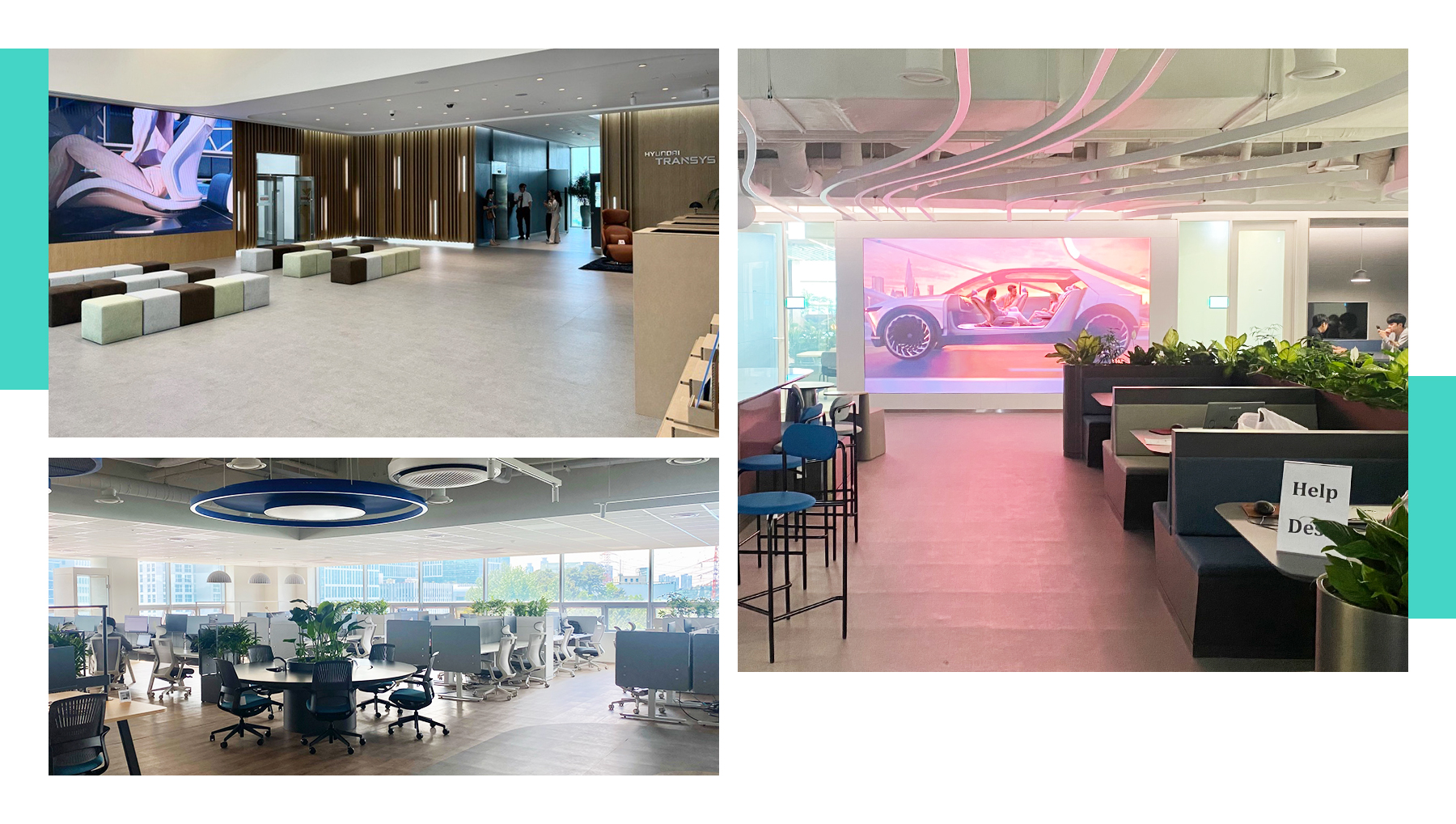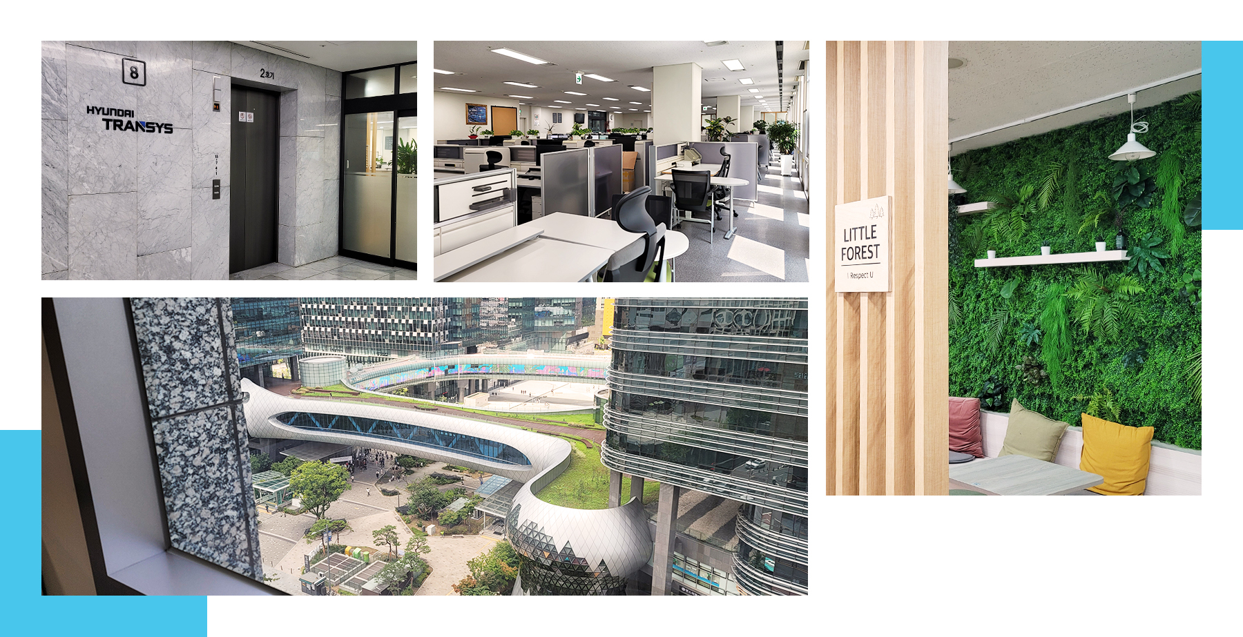 저희 사업운영팀은 현대트랜시스 영업본부의 컨트롤 타워로, 회사의 사업과 영업을 지원하는 업무를 담당합니다. 회의와 보고를 위한 꼼꼼한 자료 작성은 물론, 사내 여러 팀과의 커뮤니케이션 역할도 수행하고 있습니다. 영업본부는 국내 여섯 개 팀, 해외 세 개 지점(미국 미시건, 미국 캘리포니아, 중국 상하이)으로 구성되어 있습니다. 국내 영업 조직이 위치한 판교 사무소는 다른 사업장에 비하면 비교적 작은 규모이지만, 미국, 유럽, 아시아 등 전 세계 다양한 고객사들과 소통하며 글로벌하고 다채로운 업무를 경험할 수 있다는 장점이 있습니다. 해외 고객들과 커뮤니케이션해야 할 일이 많은 직원들은 시차로 인해 새벽 회의나 밤 늦게 근무를 해야하는 경우도 있는데, 판교사무소에는 이러한 직원들을 위해 '리틀포레스트'와 '라이트하우스'라는 자그마한 휴게공간을 갖추고 있습니다. 주변 자연경관과 함께 휴식을 취하거나, 매일 아침 제공되는 조식도 먹을 수 있죠. 넓은 창문 너머 판교역의 시원한 경치도 이곳의 매력입니다.