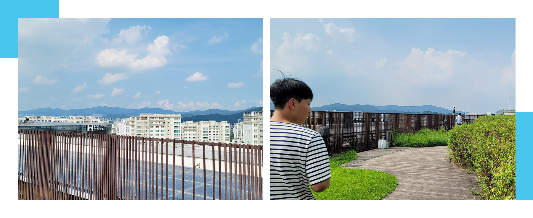 옥상 정원을 가장 좋아합니다. 현대백화점 13층에 녹음이 우거진 정원인데요. 소소한 공간이지만, 판교의 전경을 한 눈에 감상할 수 있어 좋습니다. 햇빛을 듬뿍 쬐면서 사무실에만 있을 때는 부족한 광합성을 하기도 하죠. 그러다 보면 어느 새 피로가 풀립니다. 때로는 휴식시간과 퇴근 길에 백화점 곳곳을 둘러보기도 합니다. 언제든 편리하게 쇼핑을 하거나 다양한 사람이 오가는 풍경을 구경할 수 있는 건 판교사무소만의 장점이자 재미라고 생각합니다.