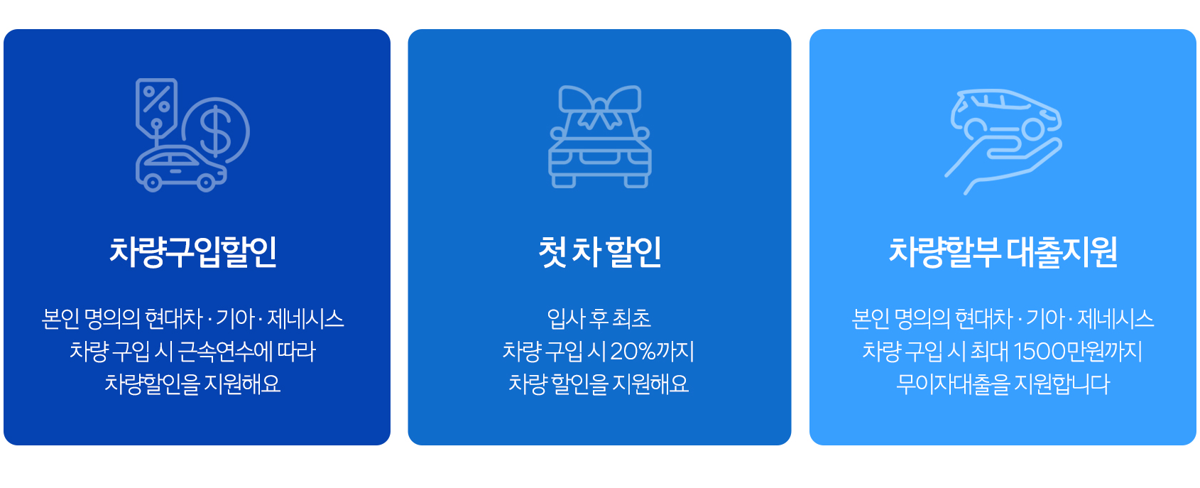 특히 신입 사원들이 반가워할 만한 복지, 첫차 할인 제도입니다. 입사 후 첫 차를 구입하는 임직원들에게 차량 가격의 20% 할인을 지원해주는 제도입니다. 입사 1년이 지나면 이후 근속연수는 상관없이 첫차 구매에 대해 적용됩니다.