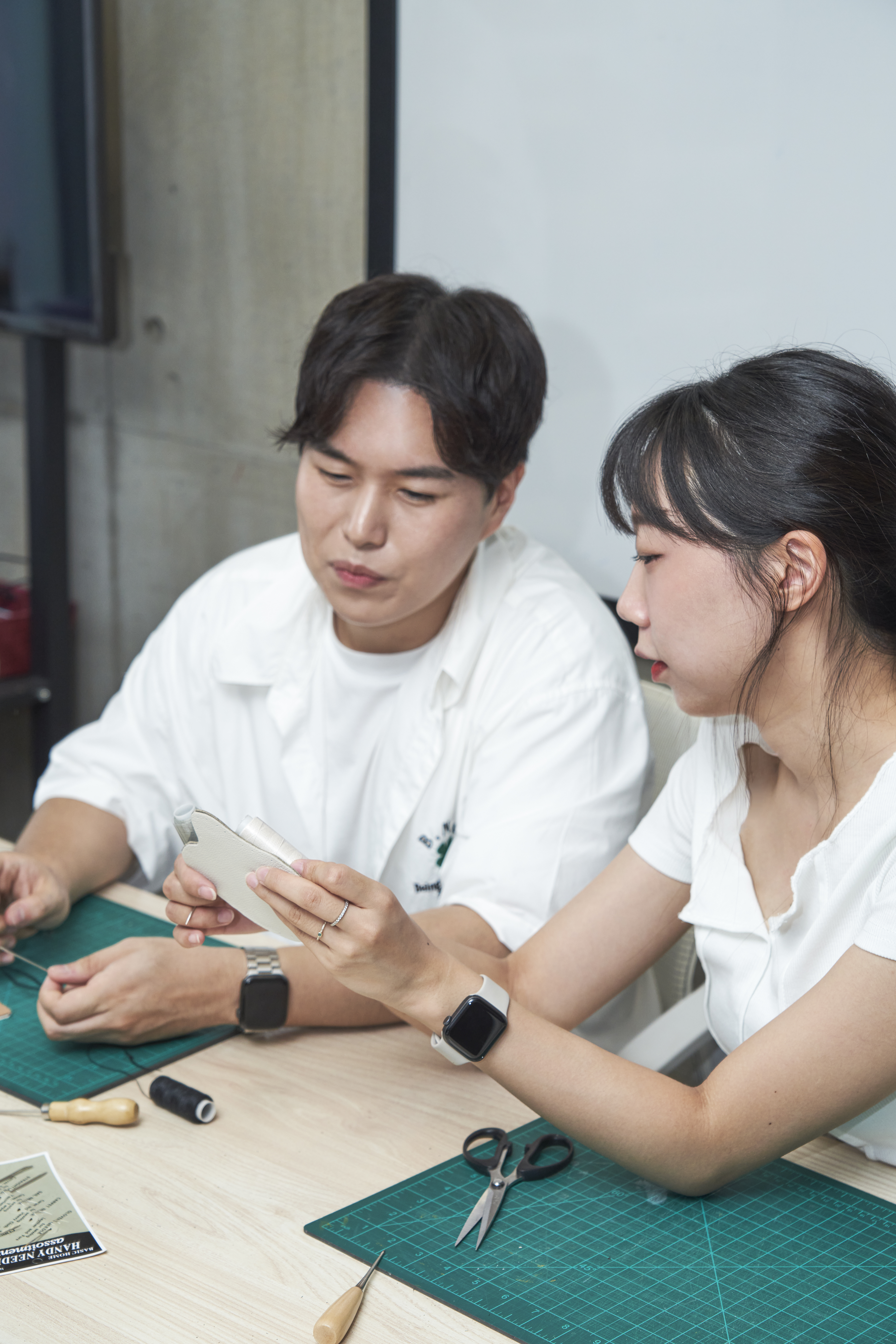 원하는 모형으로 두 장의 가죽을 재단한 후에는 접착과 박음질이라는 중요한 작업에 들어갑니다. 그런데 가죽 양면 가장자리를 박음질로 단단하게 고정하는 데 생각보다 오랜 시간이 걸렸습니다. 표면은 부드럽지만, 두툼한 천가죽을 손으로 꿰매기가 쉽지 않았기 때문인데요. 다행히 모두가 끈기를 발휘해 끝까지 바느질을 마칠 수 있었습니다.