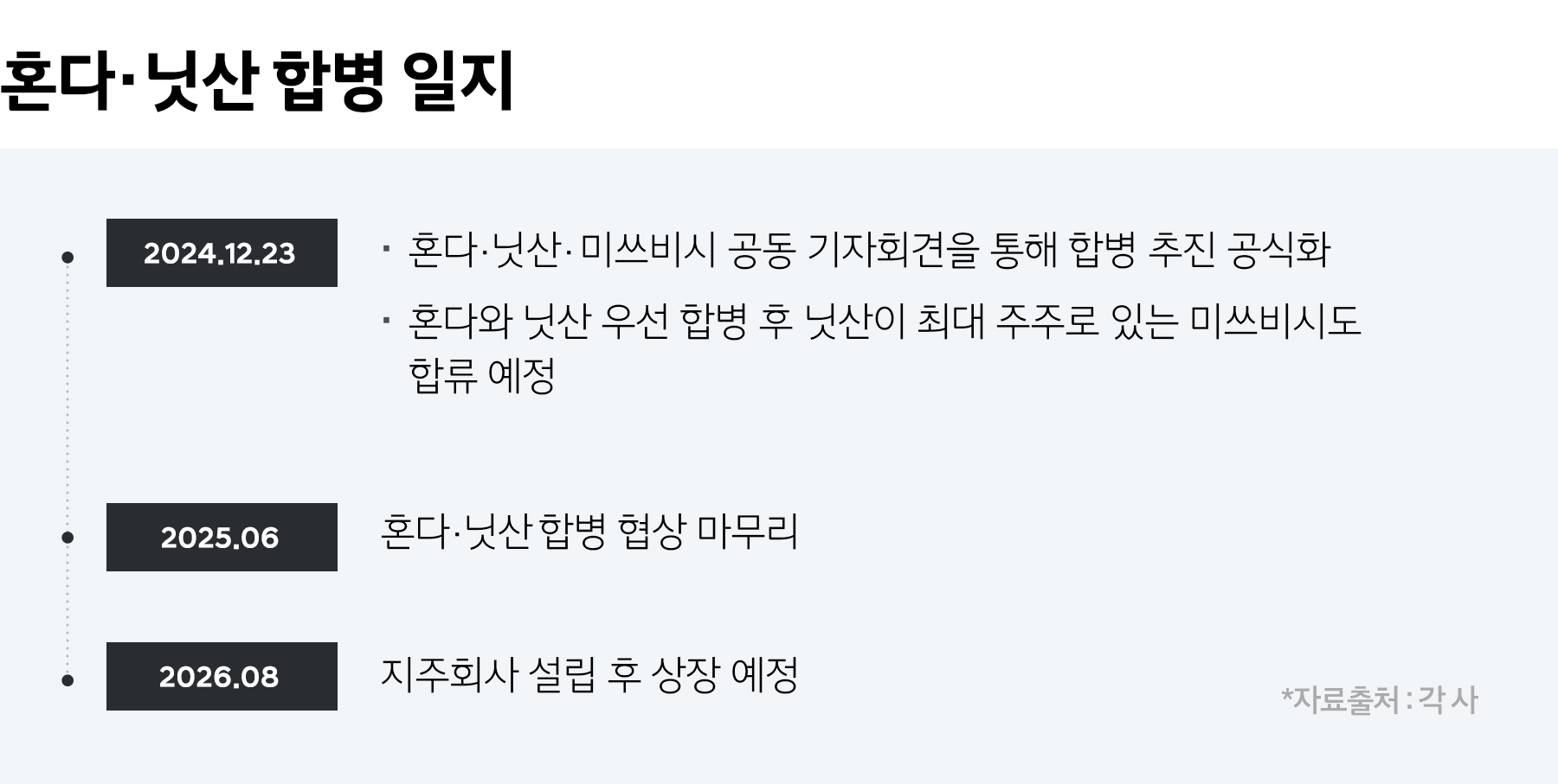 일본 2위와 3위 자동차 업체인 혼다와 닛산이 지난달 23일 도쿄에서 공동 기자회견을 갖고 합병 추진을 공식화했습니다. 내년 6월까지 협상을 마무리하고, 2026년 8월에는 이 회사들을 운영할 지주회사를 설립해 상장시킬 계획입니다. 새롭게 탄생하는 자동차 그룹은 현대차그룹을 제치고 글로벌 3위에 오르게 됩니다. 닛산이 최대 주주로 있는 일본 4위 업체 미쓰비시는 올해 1월까지 검토를 거쳐 합병 여부를 판단합니다.