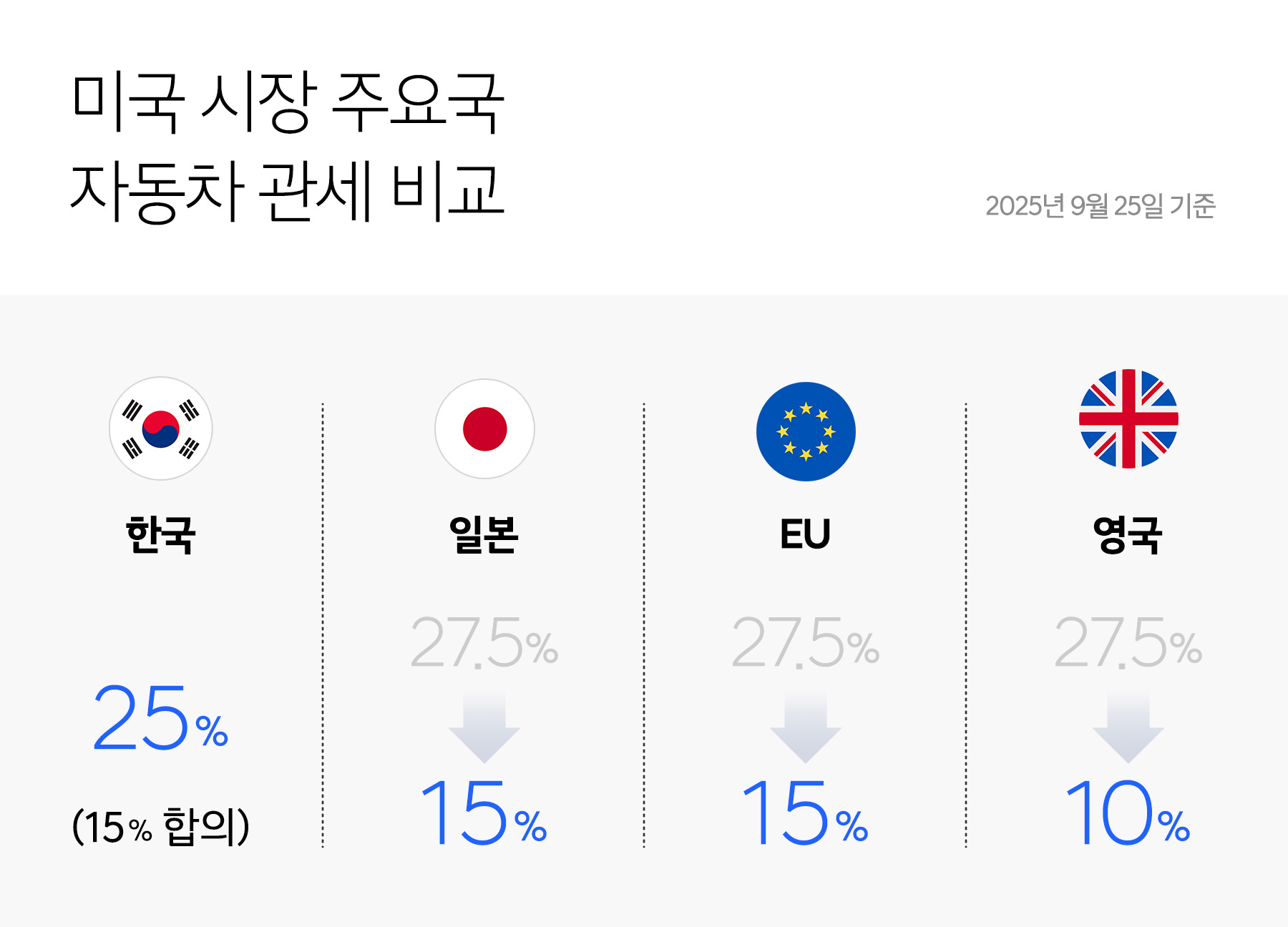 미국이 일본과 체결한 무역합의에 따라 9월 16일부터 일본산 자동차에 부과되는 관세를 기존 25%에서 15%로 인하한데 이어, EU와도 유럽산 자동차 및 자동차 부품에 대한 관세율을 15%로 확정했습니다.