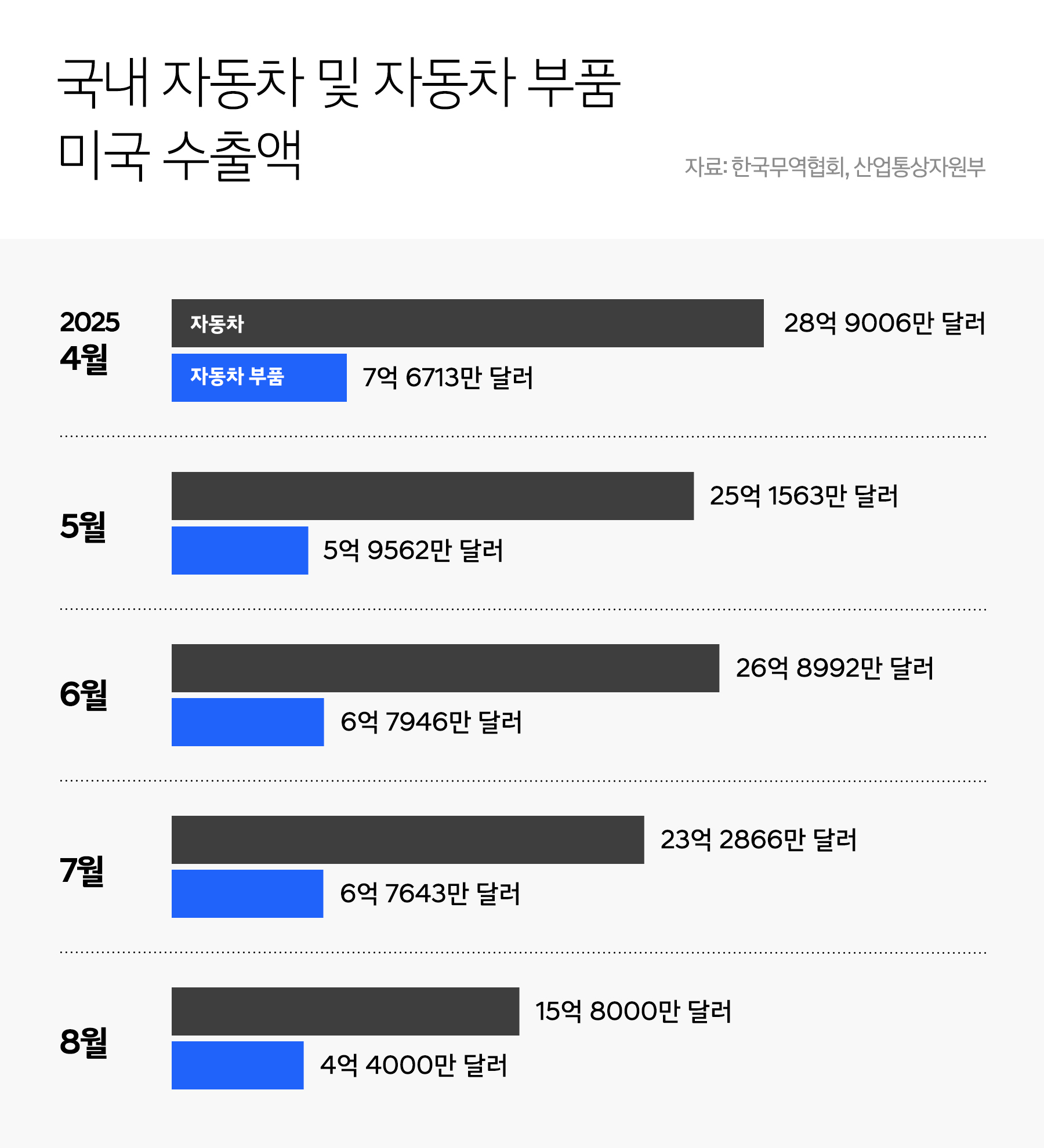 관세 여파로 한국의 대미 자동차 수출도 타격을 받고 있습니다. 한국무역협회에 따르면 올 들어 7월까지 대미 자동차 수출액은 전년 동기 대비 15.1% 감소한 182억달러(약 25조4891억원)로 집계됐습니다. 자동차 부품업계도 생존을 걱정해야 하는 상황으로 내몰렸습니다. 완성차 수출이 타격받아 국내 생산량이 감소하면 차 부품·소재 협력사도 그만큼 힘들어지게 됩니다. 국내 자동차 부품업계의 대미 수출액은 지난해 82억2200만달러(약 12조원)에 달했습니다.