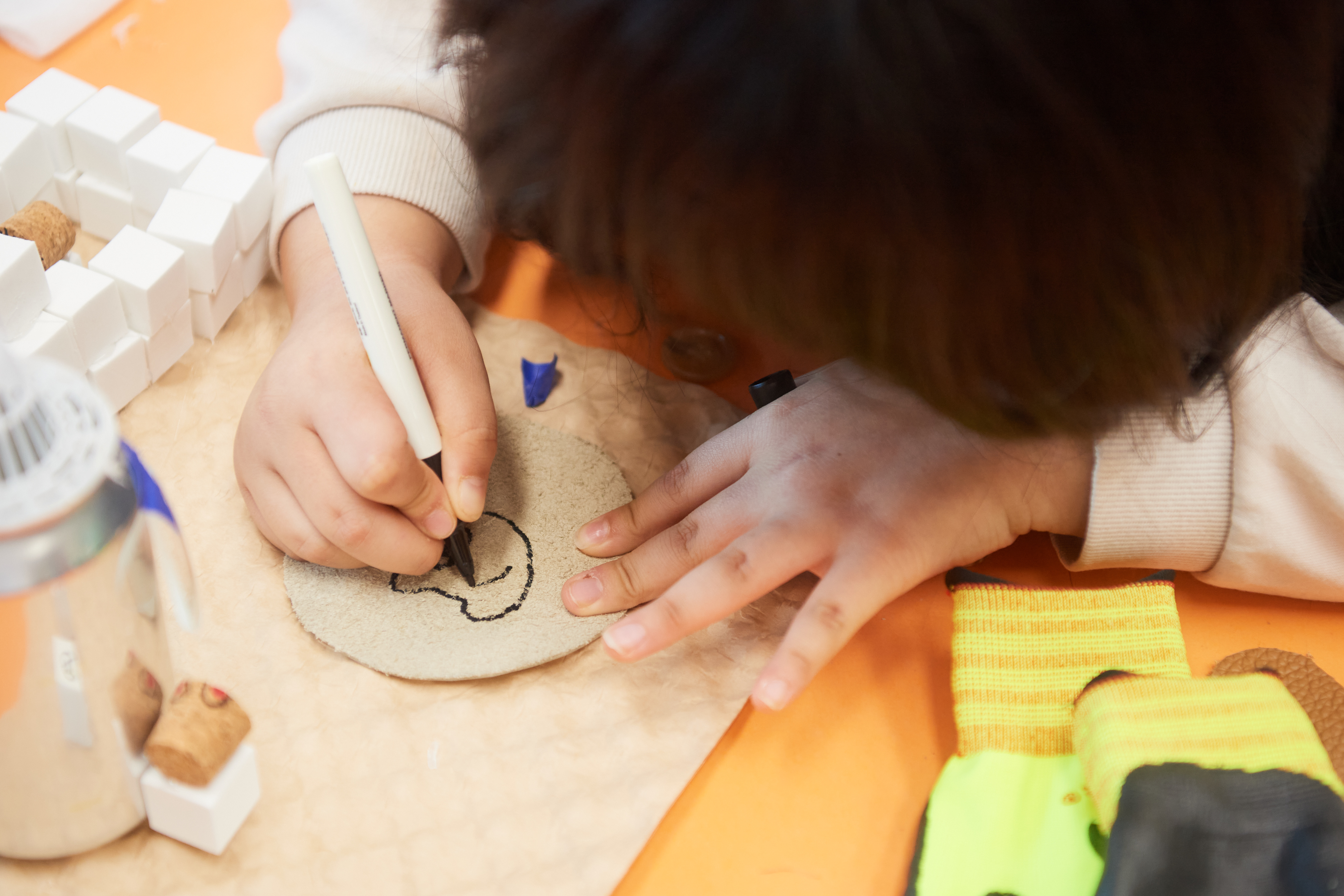 수업은 “왜 이런 재료가 남았을까?”를 설명하는 것으로 시작했습니다. 휴면자원의 개념을 이해하고 자동차 시트가 어떤 과정을 거쳐 만들어지는지, 가죽이 어떤 방식으로 눈 앞의 자투리 가죽이 되었는지 등을 아이들의 눈높이에 맞춰 알아갑니다. 이후엔 준비된 가죽과 패브릭, 플라스틱 조각 등을 가까이에서 보고 만지며 체험하는 시간을 가졌습니다.