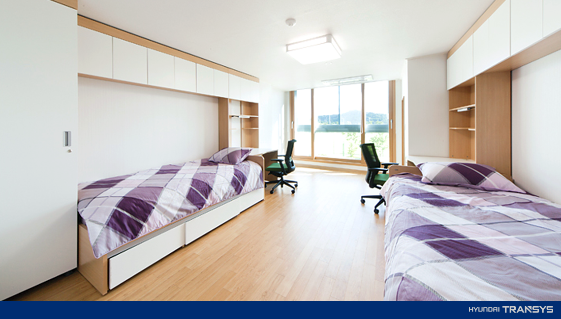 첫 번째, 회사 숙소 및 기숙사 지원입니다. 현대트랜시스는 30평 남짓의 아파트 숙소 또는 기숙사 2인실을 제공하고 있습니다. 또한, 관리비 지원(지원 기간 : 5년) 및 가전제품, 침구류 등을 제공하고 있죠. 현대트랜시스는 6년 동안 모든 직원들에게 기숙사를 제공하고 있습니다. 총무팀을 통해 절차를 진행하면 숙소에 들어갈 수 있습니다. 한편 주택 자금 대출자 또는 1회 퇴숙 절차를 진행한 자는 숙소 이용이 불가합니다.