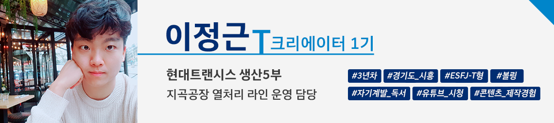 저는 현대트랜시스에 입사한 지 3년 차인 이정근 매니저입니다. 제가 이 회사를 다니는 동안 느낀 장점 중 한 가지는 회사의 복지 시스템입니다. 그중에서도 전화영어와 1:1 사내영어 강의 지원을 받아 외국어 회화 능력을 키울 수 있게 해준 제도가 가장 마음에 듭니다. 그 외에도 다양한 복지 혜택이 직원들에게 애사심을 키울 수 있게 해줍니다.